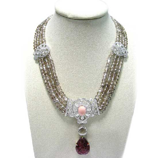 This elegant necklace comes with four strands of beads complemented with sparkling diamonds. The carved teardrop spinel dangles at the front adding a spicy touch to the look. This attractive diamond necklace is easy to mix and match.