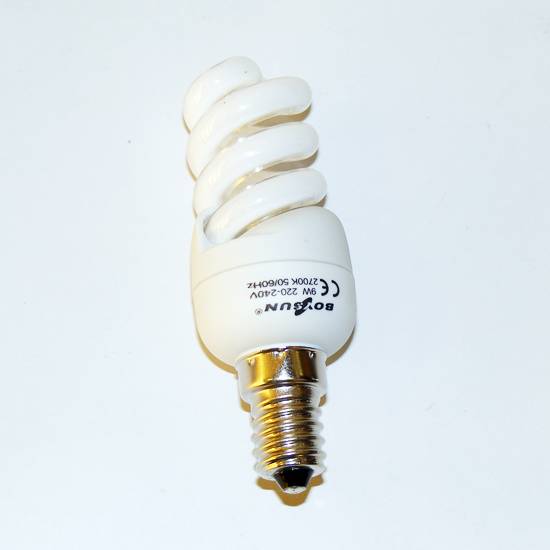This is an energy saving bulb in spiral shape. The power of the bulb is 9 watts which generates bright light in high luminance. Light bulb with voltage range from: 220-240 V.
