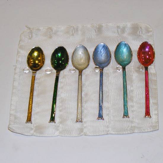 The featuring items are a gift set of six coffee serving spoons made of brass. Each of them has an unique colour, including white, red, yellow and green, showing a shimmering and aristocratic style.