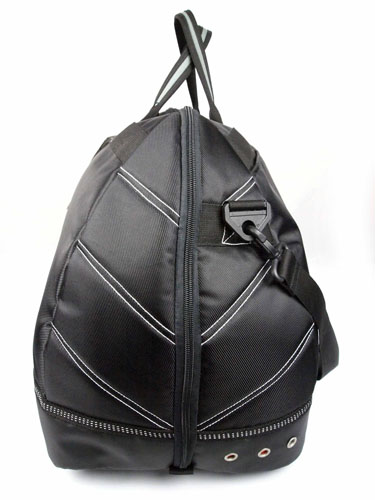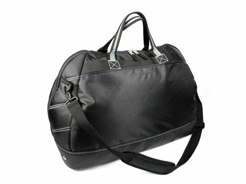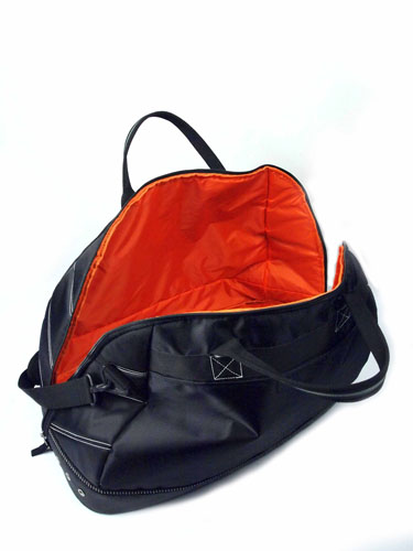 The sleek black duffle bag features striped handles and an adjustable shoulder strap. The double line stitchings exquisitely adorn on both sides like leave veins. The interior is fully lined and comes in sharp orange color, offering you the chromatic splendor.