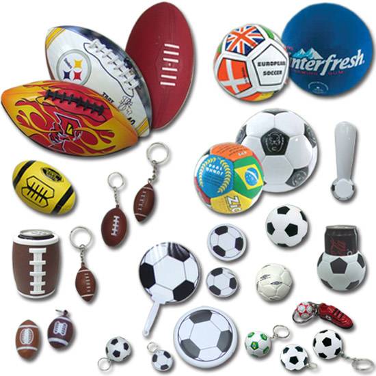 the picture features differnet kinds of novelties with American football and soccerball appearances. These items include ball, can holder, key chain and softball etc. They are great gifts for American football and soccer lovers.