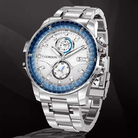 This is a sports chronograph watch that features a stainless steel structure. The round dial face has three hands, two sub-dials and a date window display. This classy and durable men's watch is perfect for everyday wear.