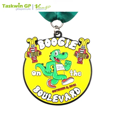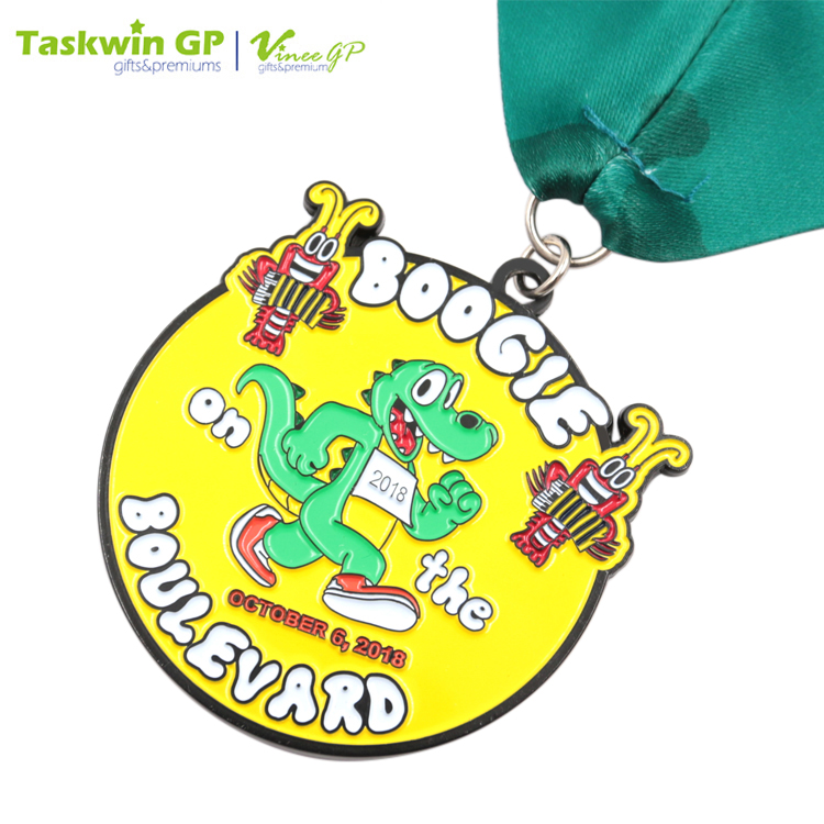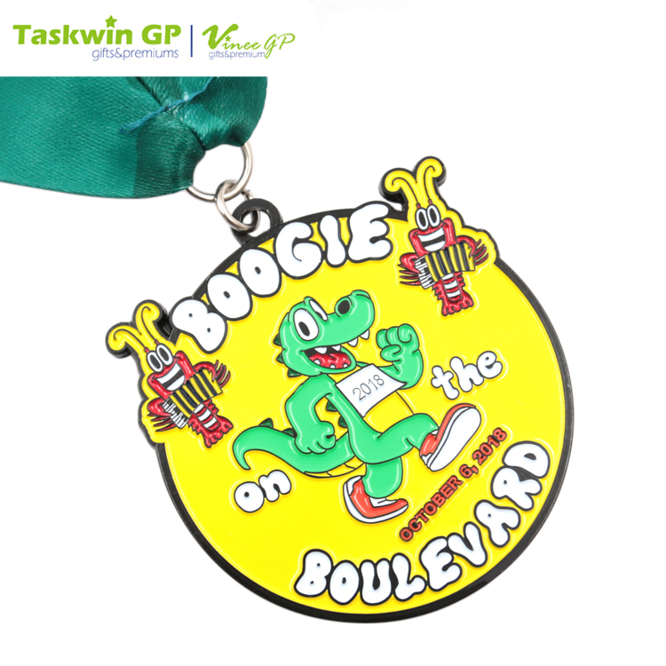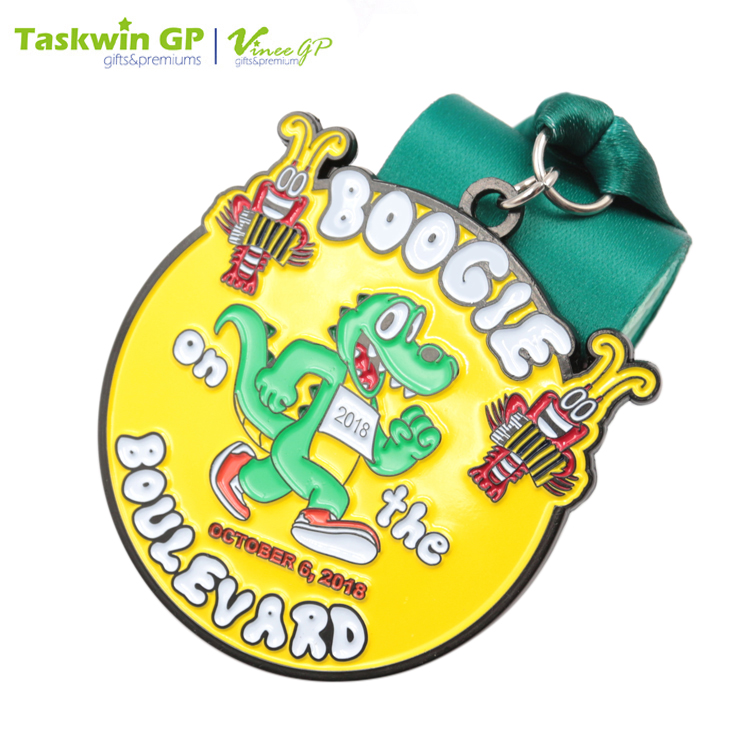 This medal is made of die cast zinc alloy and is plated in dye black. It comes in a round shape and is adorned with a cartoonish running crocodile. Included with the zinc alloy medal is a ribbon for wearing around the neck. The medal is great as a reward for good performance and is suitable for sports and other events.