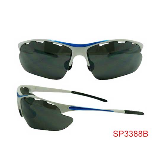 Displayed is a pair of sports sunglasses made of high quality PC for durability and a comfortable wearing experience. With an adjustable nose pad and rubber tips, this pair of sunglasses will suit you very well. Enjoy doing sports with this cool pair of sunglasses.