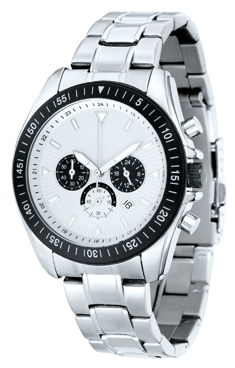 This alloy watch has is equipped with a Japan chronograph movement and delivers outstanding precision. It has a round dial with three sub-dials and has a window for showing the date. The watch has a plastic numbered turning bezel and is paired with a semi-solid S/S bracelet for comfortable wearing.