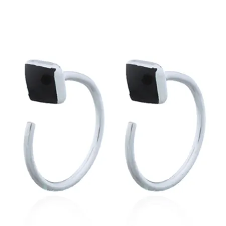 Square Black Agate 925 Silver Huggie Drop Earrings
