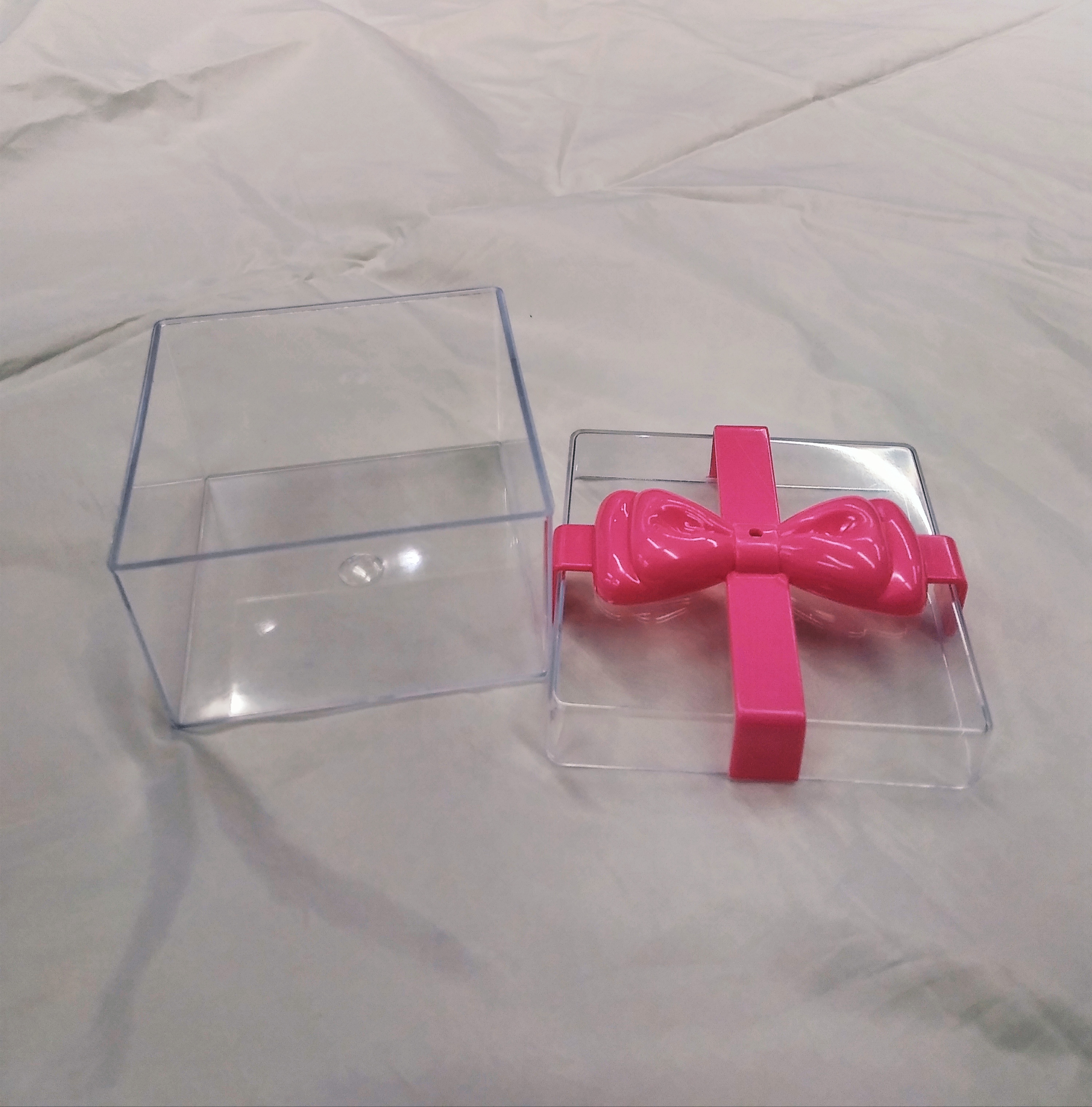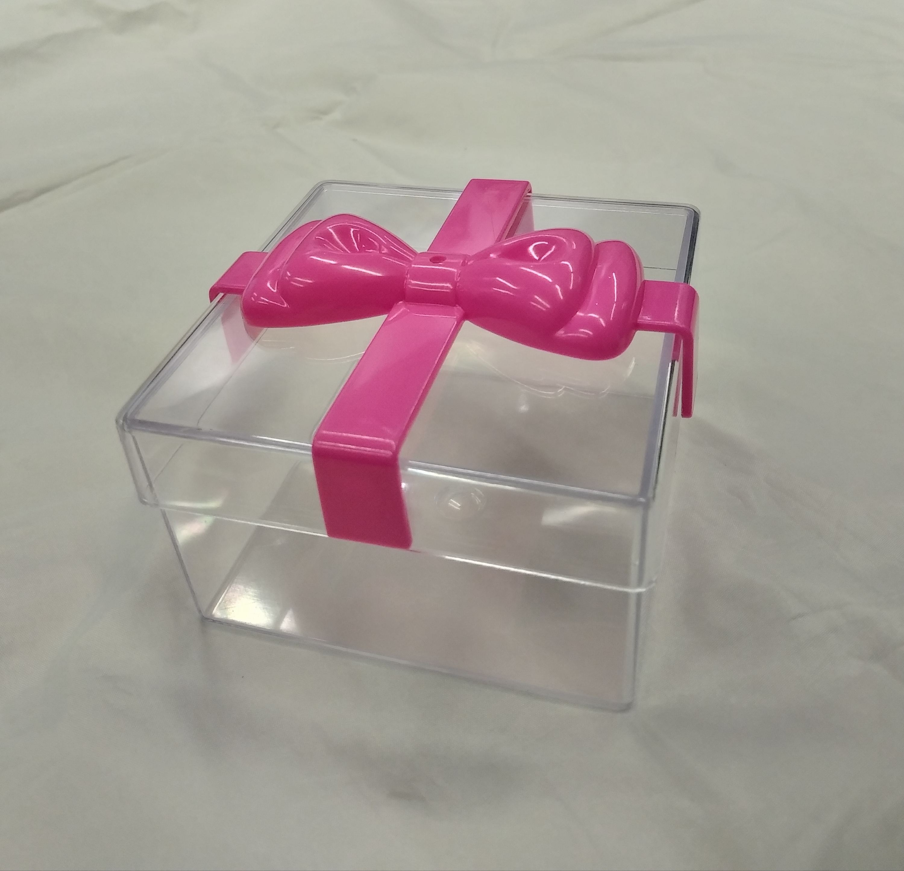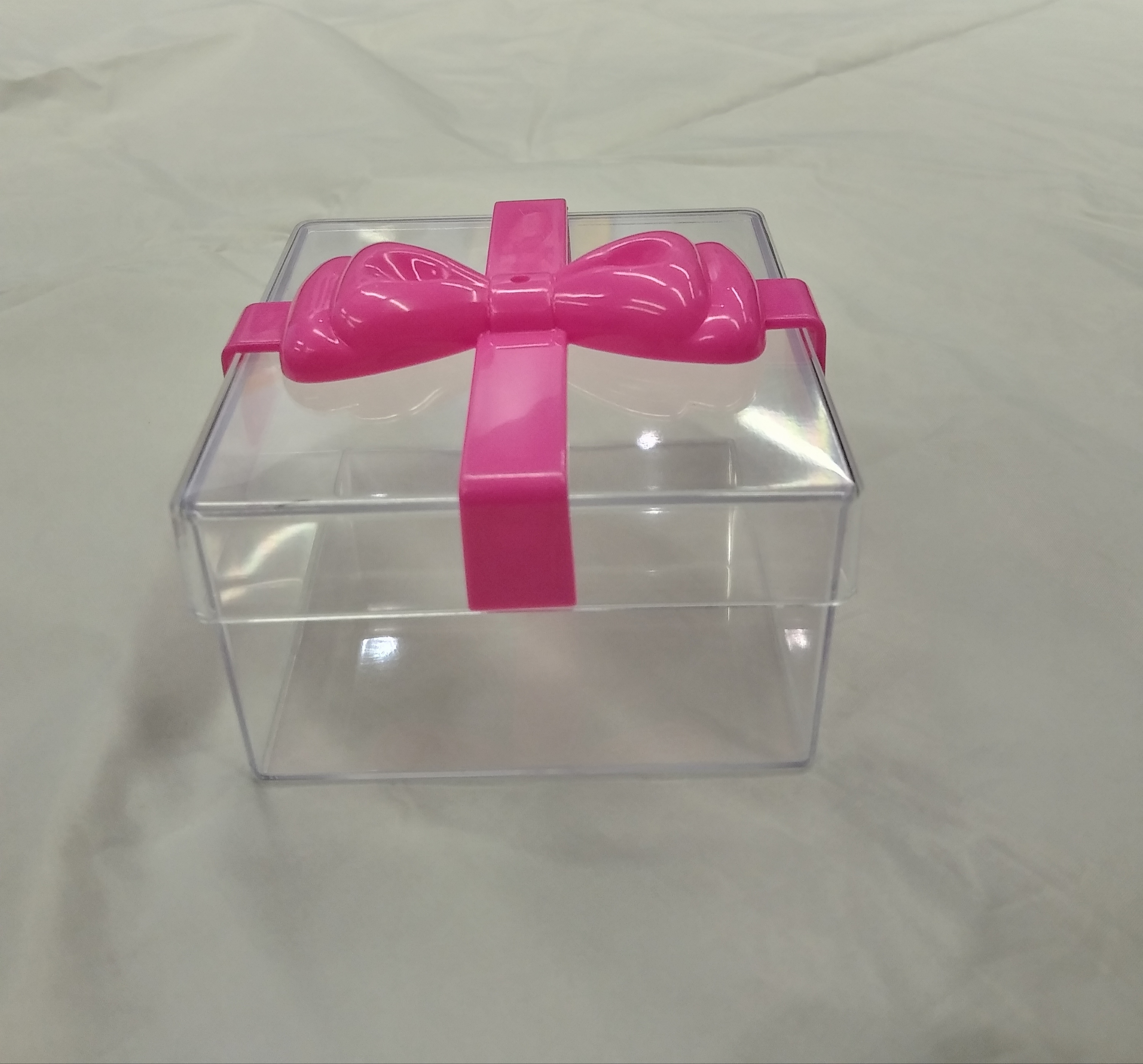 • Features: Square shape; square shaped; box; container; gift box; candy box; candy container; transparent; clear; rigid plastic packaging container; food grade; reusable; recyclable; with plated bow lid; storage