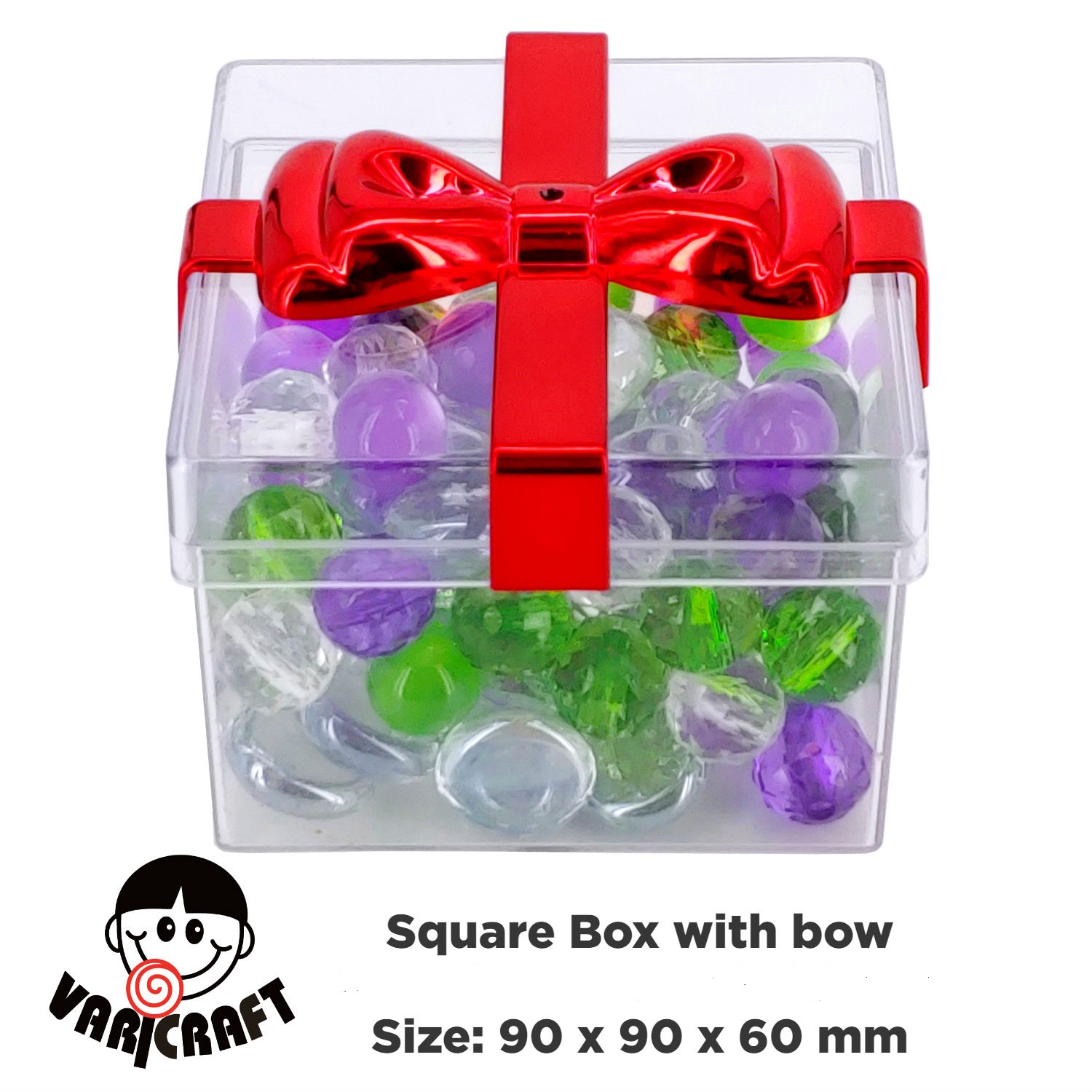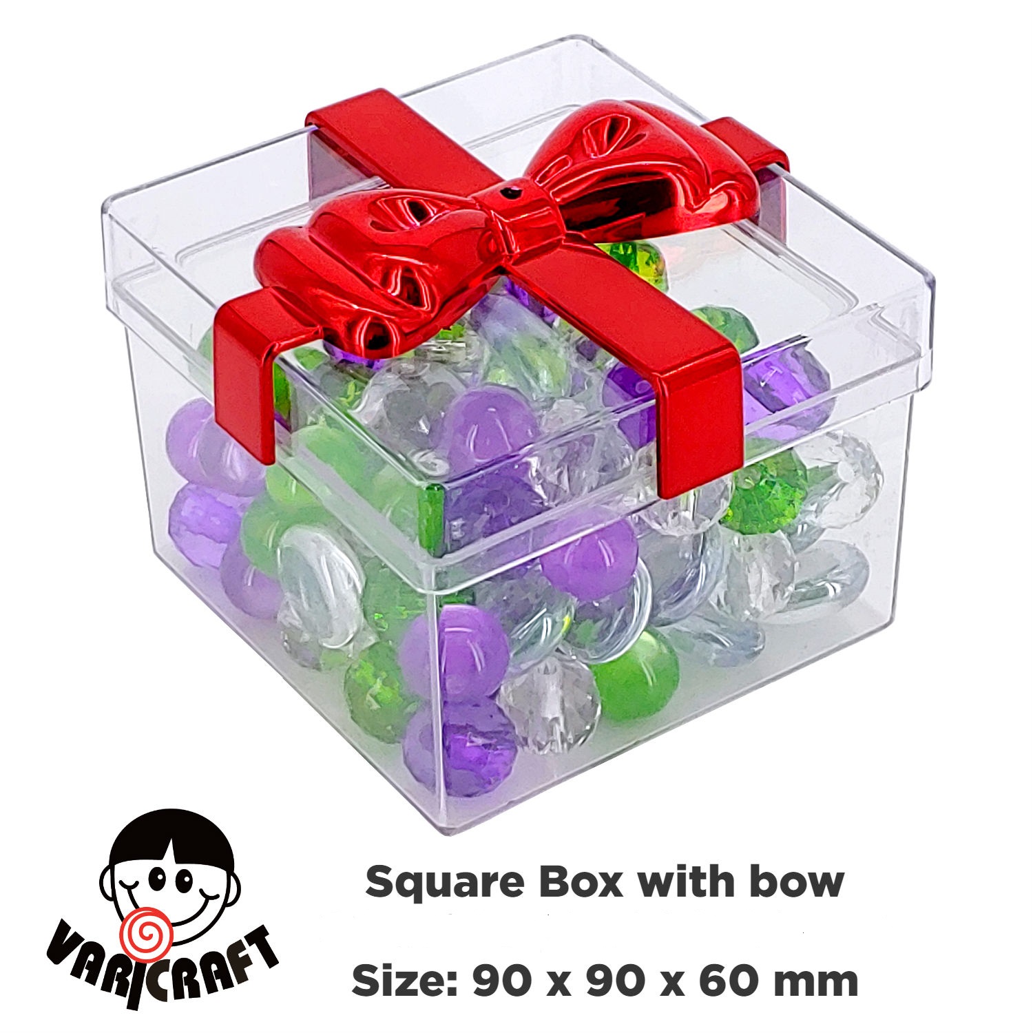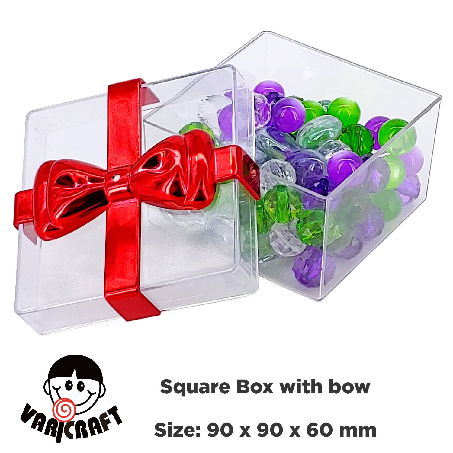 • Features: Square shape; square shaped; box; container; gift box; candy box; candy container; transparent; clear; rigid plastic packaging container; food grade; reusable; recyclable; with plated bow lid; storage