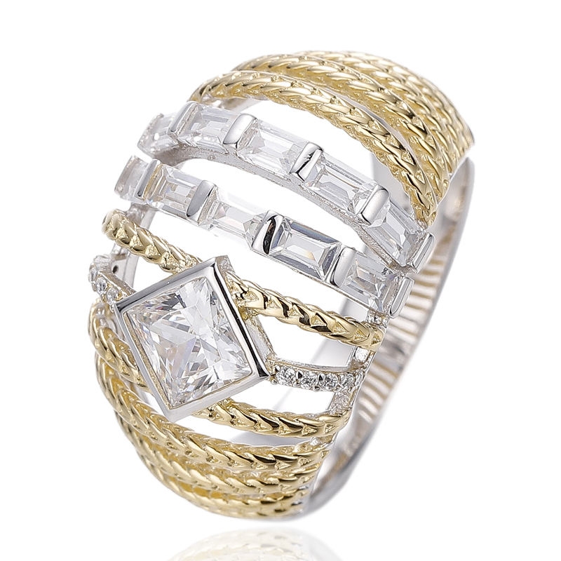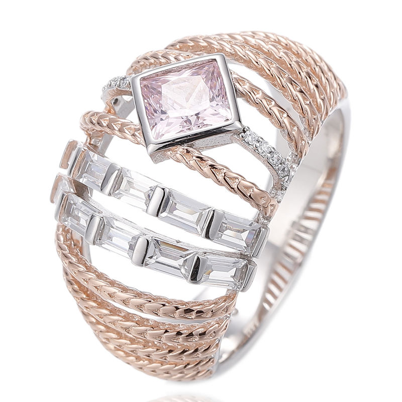 Square Diamond Pink And Baguete White Cubic Zircon Silver Ring With Rhodium And Rose Gold Plating