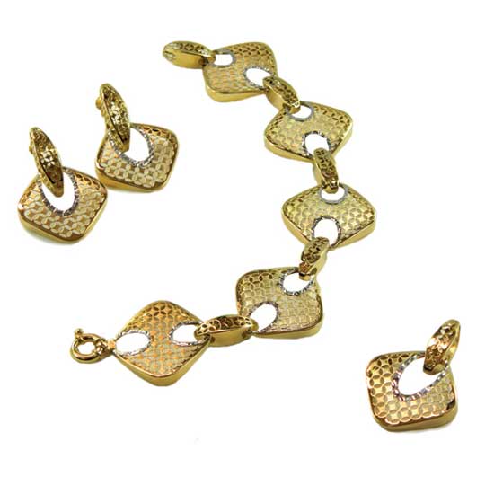 The gold jewelry includes a bracelet, a pendant and a pair of earrings. The items are hung with square-shaped charms with matching patterns on the surface. These pieces of jewelry will add a unique and luxurious finish to your grand look.