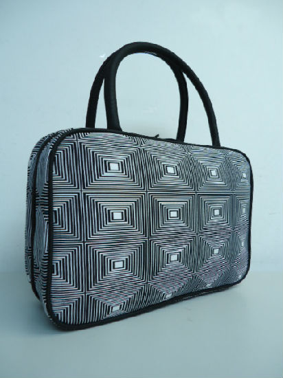 • Square line printed cotton with polyester handle cosmetic bag.