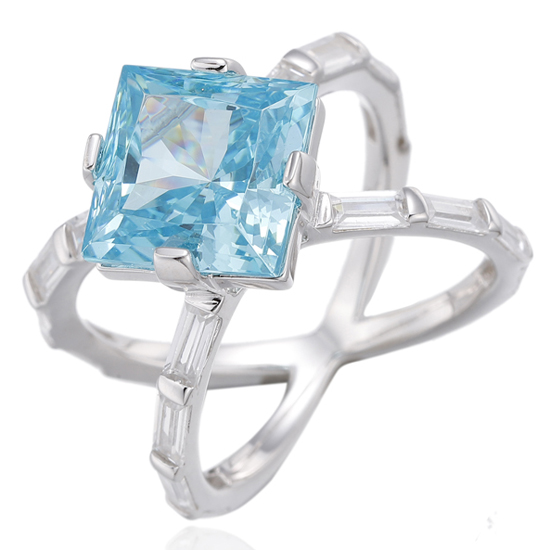 Square Paraiba And Baguette White Cubic Zircon Rhodium Silver Ring