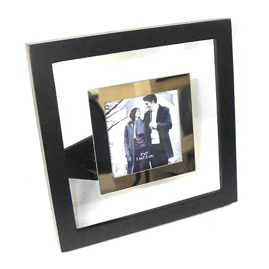 This square photo frame features a unique double-square-frame style. The outer square frame features a glossy finish and the inner square is finished in a metallic color. Transparent material fills the space between the two squares for added style.