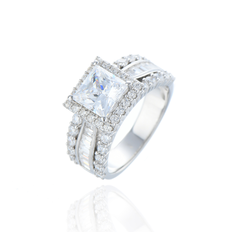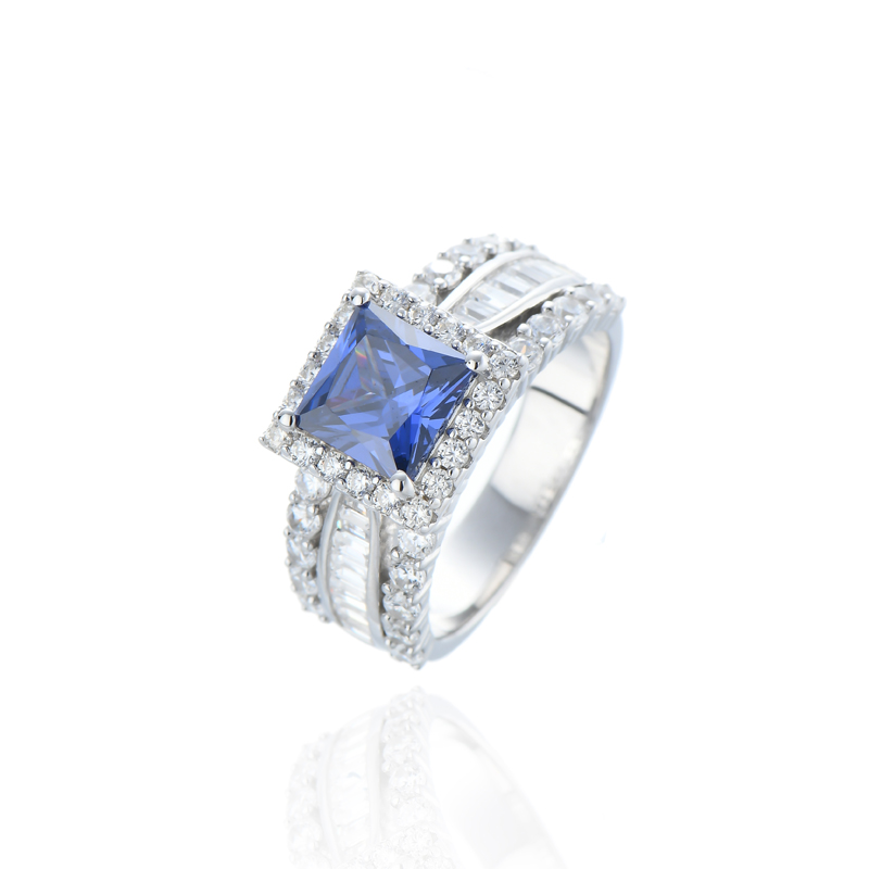 Square Tanzanite And White Cubic Zircon Rhodium Silver Ring