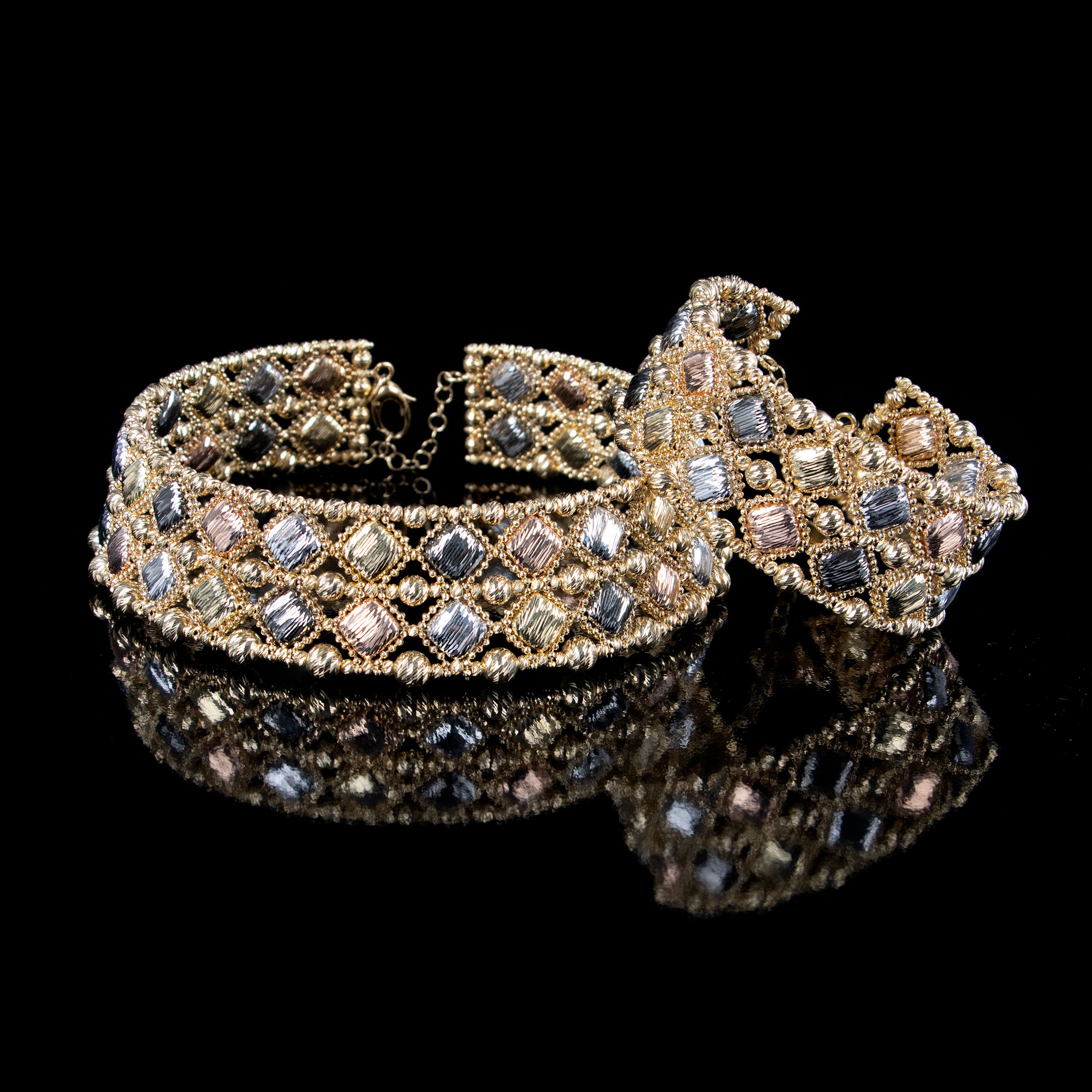 Fashionable rigid diamond cut multi coloured gold rigid necklace made in Italy.