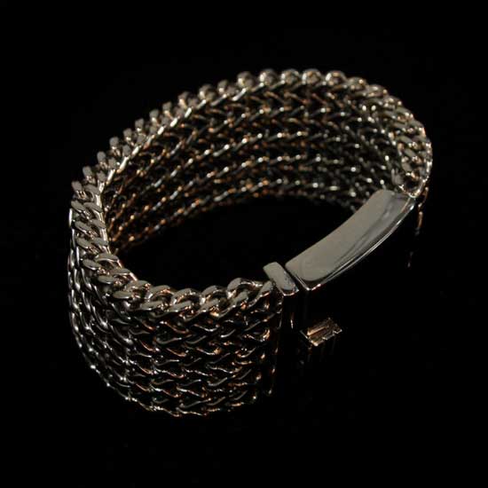 The bangle is sturdily made of stainless steel to ensure sturdiness and durability. It is comprised of multiple rows of metal chains which constitute a stylish broad design. Featuring a strong surface luster, this bangle gets your wrist noticed in an instant.