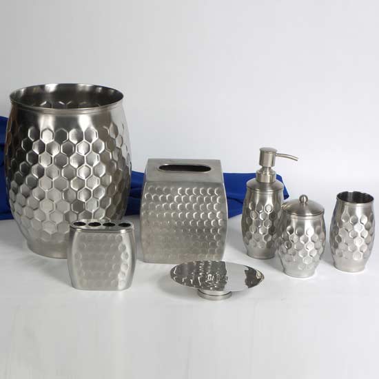 This is a bathroom set including a liquid soap dispenser, a tissue holder and a soap holder. The embossed patterns look exceptionally elegant on the mirror surface. The stainless steel material provides resistance to corrosion, especially suitable for use in bathrooms.