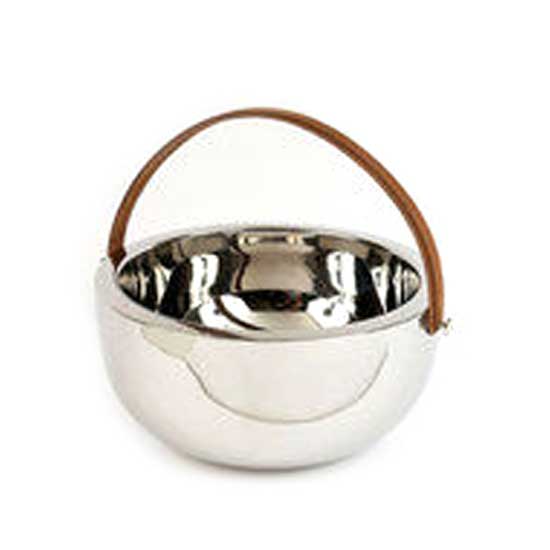 This presented double-wall bowl features an extremely beautiful pure round form. It is accented with an elegant genuine leather handle. This is a must-have for table decoration.
