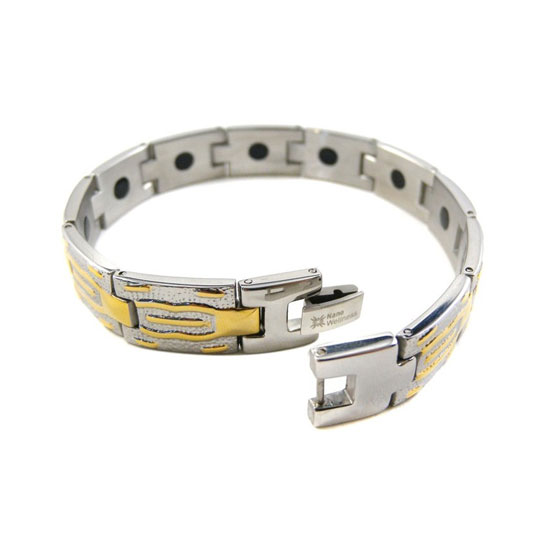 This magnetic bracelet comes with a stylish appearance. It is designed with gold knife patterns for an eye-catching look. This reliable bracelet is made of quality stainless steel for durability.