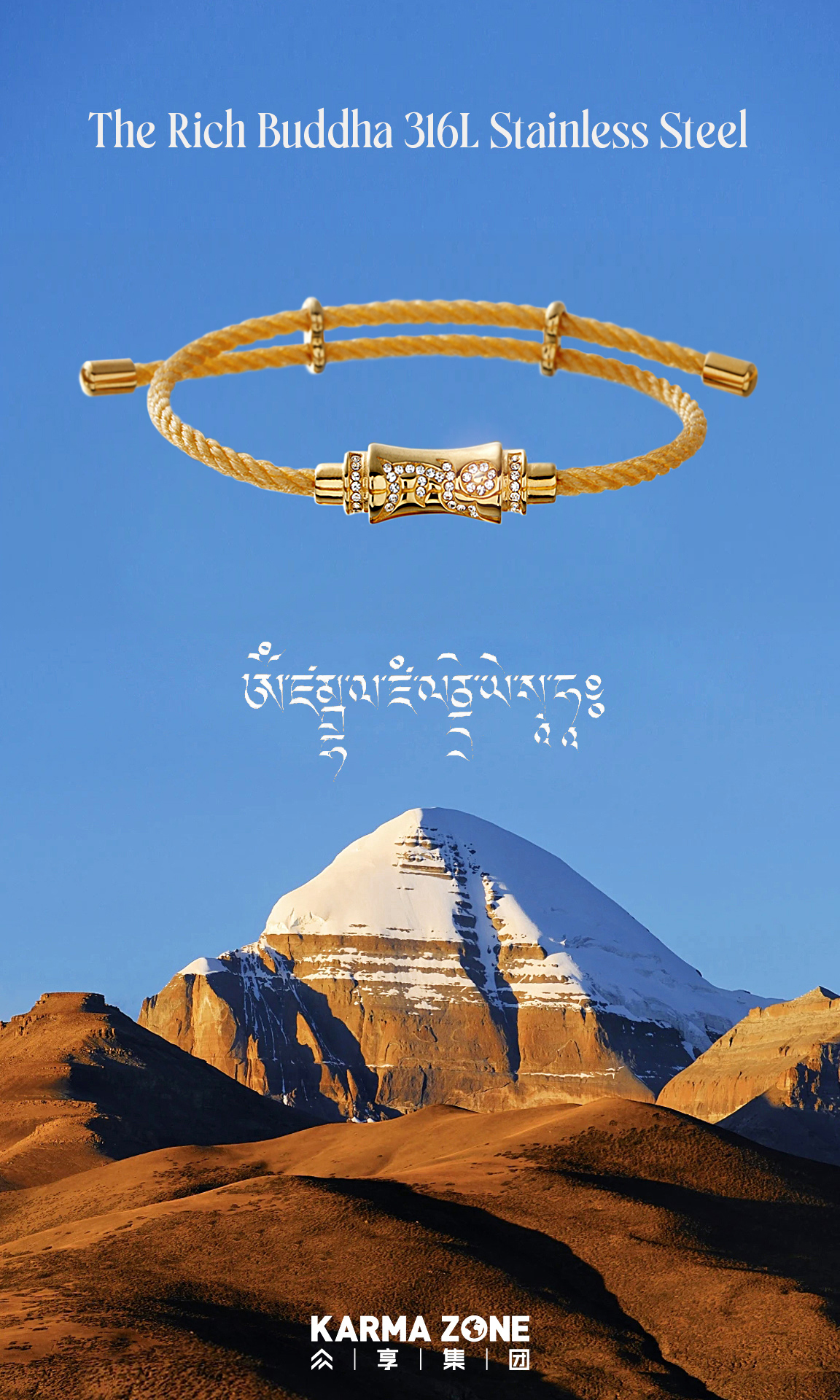This women's bracelet belongs to The Rich Buddha collection, a design inspired by prosperity, inner balance, and refined elegance. Crafted with 18K gold-tone stainless steel components, the bracelet combines spiritual symbolism with modern jewelry aesthetics.