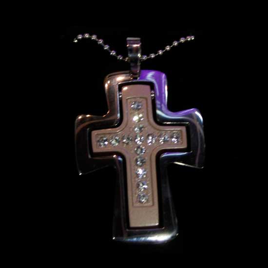 This stainless steel necklace is designed in a simplistic cross shape. Sparkling CZ are added for a sweet, girlish touch. This fancy necklace is an ideal accessory for casual occasions.