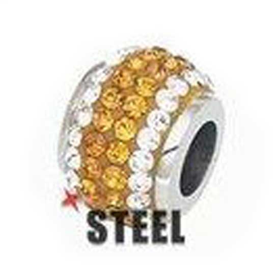 This stainless steel charm comes in a ring shaped design for uniqueness. It is ornamented with four rows of stones in yellow and white for a brilliant touch. This practical stainless steel charm is ideal for complementing your jewelry designs.