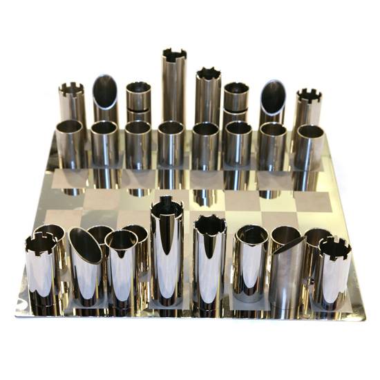 This is a stainless steel chess set with different top edges for distinguishing the chessmen. There are shiny and frosted checkers for the chessboard.