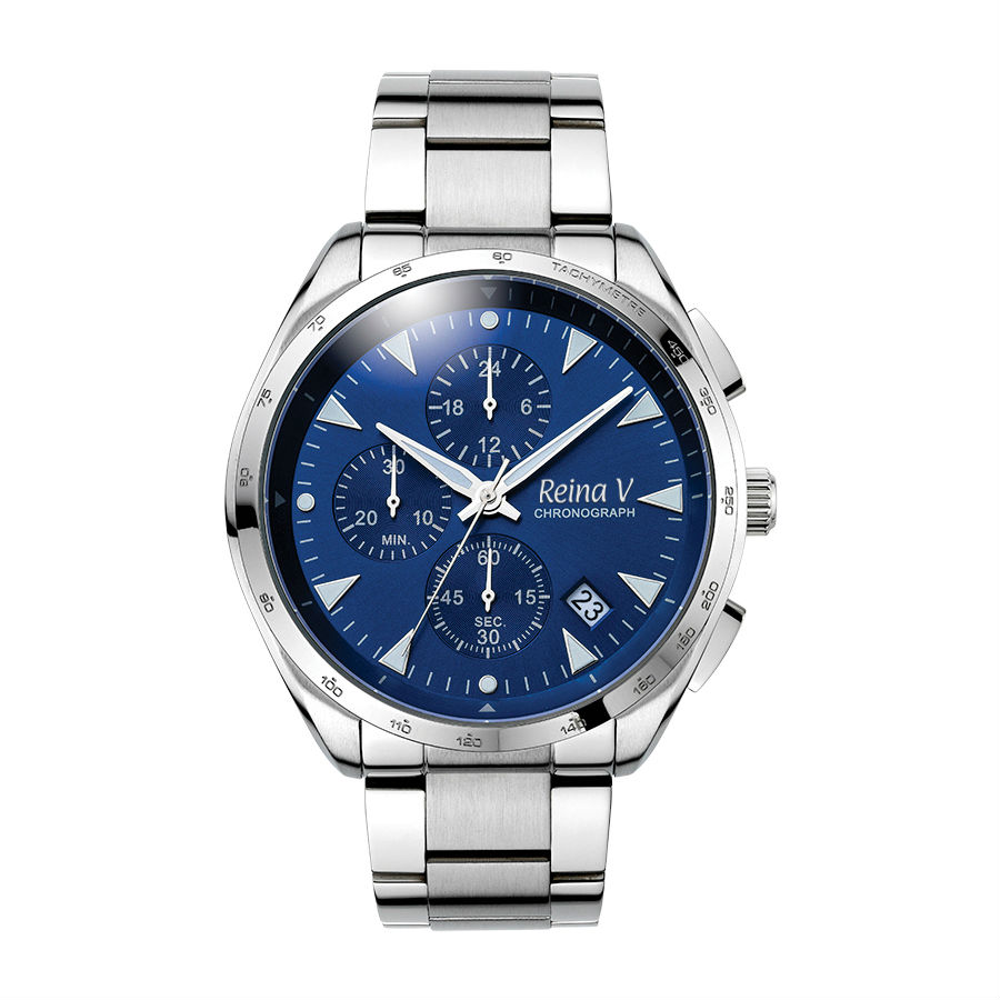 - Three sub-dials and a date window.
