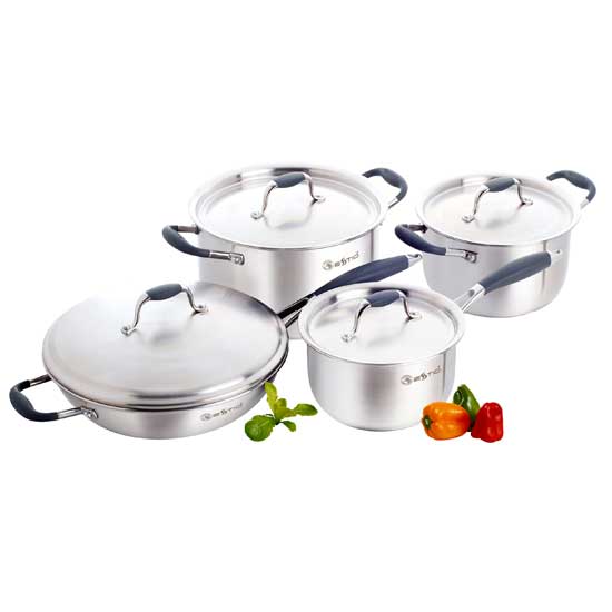 Highlighted here is a set of stainless steel cooking utensils. They are resistant to corrosion, scratches and dents, ensuring excellent endurance. Pots and pans are included in this set of stainless steel cooking utensils.