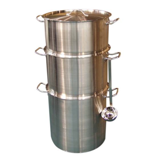 Featured is a stainless steel cookware set, made up of mainly 3 oval shaped pots and other pieces including rack, glass lid and etc. Suitable for everyday household use.