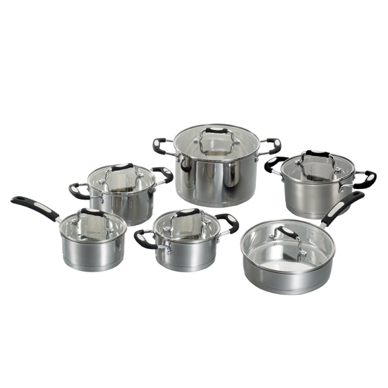 The cookware set is accompanied with glassy lids, so you can monitor your food without the lid opening. A silvery plate adheres on the black handles, showing its special design. The sleek mirrored interior let you clean the stainless steel utensils easily.