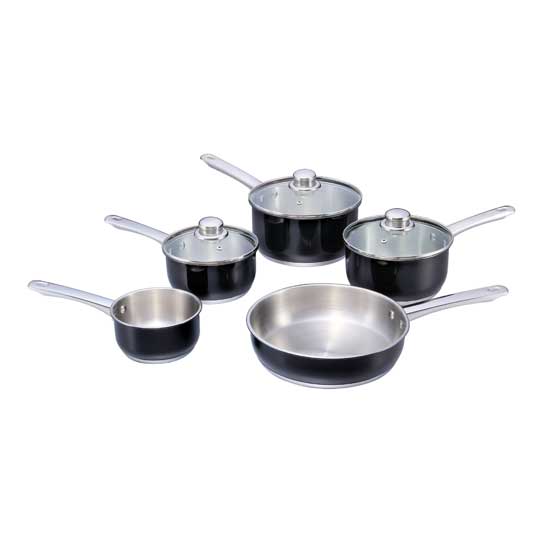 This is an 8-piece cookware set constructed from sturdy stainless steel. Each item features an elegant design with a colorful surface, a soft-touch handle and knob. This all-inclusive cookware set is an amazing addition to your kitchen.