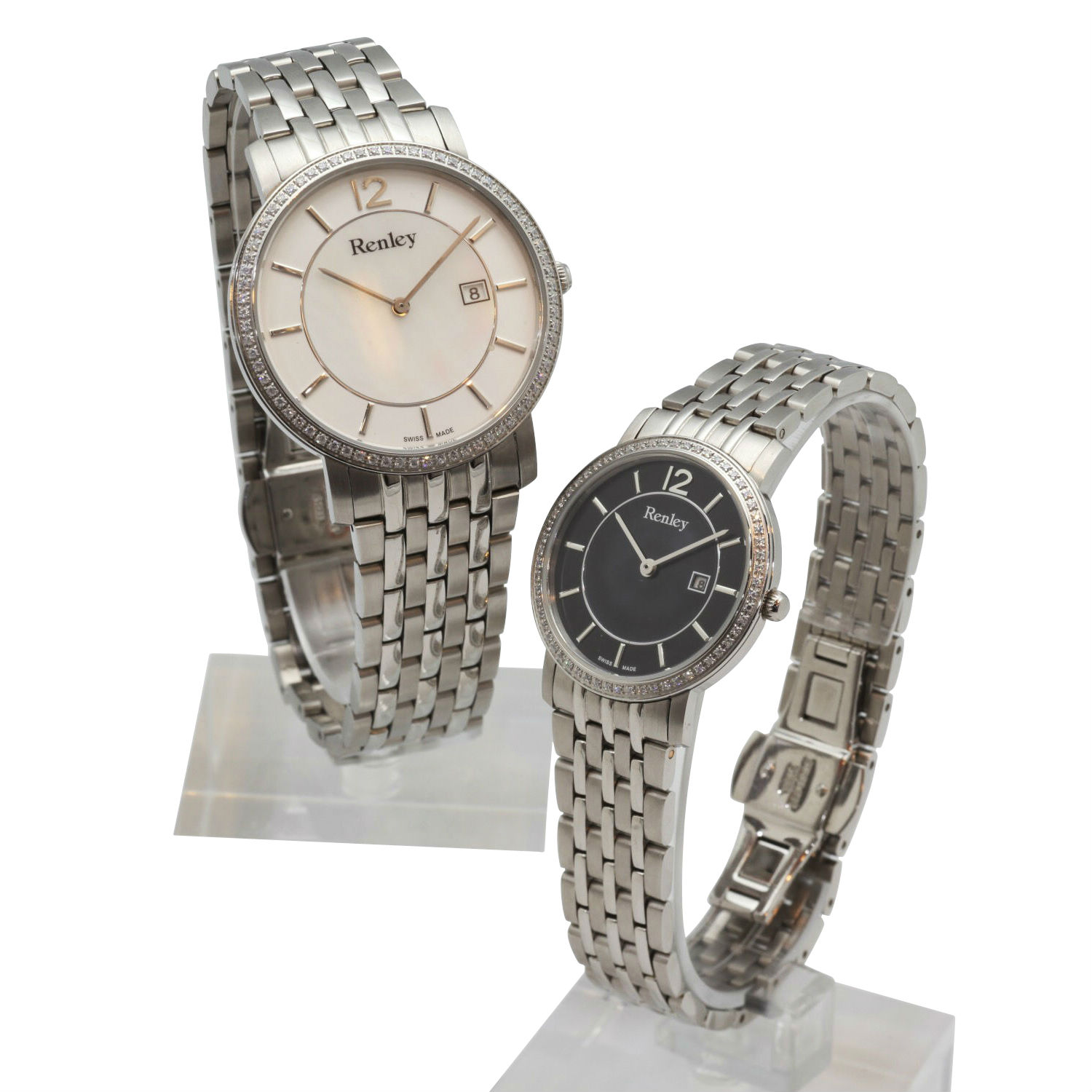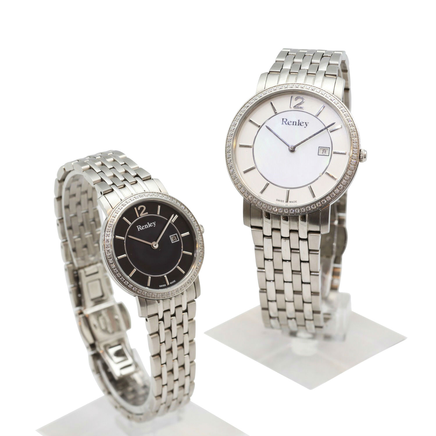 These classic stainless steel watches come in two sizes to highlight the gender differences. A plain dial, smooth silhouette and high-polished finishing complete their minimal look with CZ stone set for enhanced sparkles. Matching each other with a black dial and a white dial, they make perfect pair for you and your beloved one in a low-profile manner.