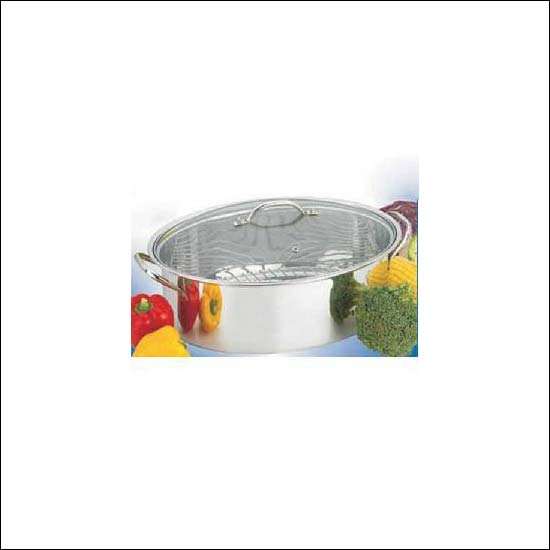 • An oval shaped stainless steel roaster with a wire rack and a glass lid.