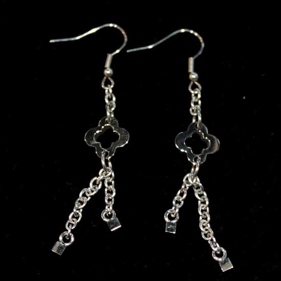 This pair of magnificent stainless steel earrings features a hollow flower charm with four petals, which hung a chain of silvery links. The links have a matt finish while the finely polished flower charms give a shiny glow. The pair of earrings comes with a fish hook. The unfettered design matches youthful dress-up.