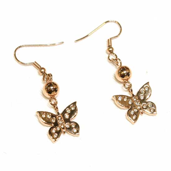 This pair of stainless steel earrings boasts a splendid golden finish. Each is dangled with a delicate butterfly-shaped pendant set with dazzling stones. The ear wires make wearing quick and easy.