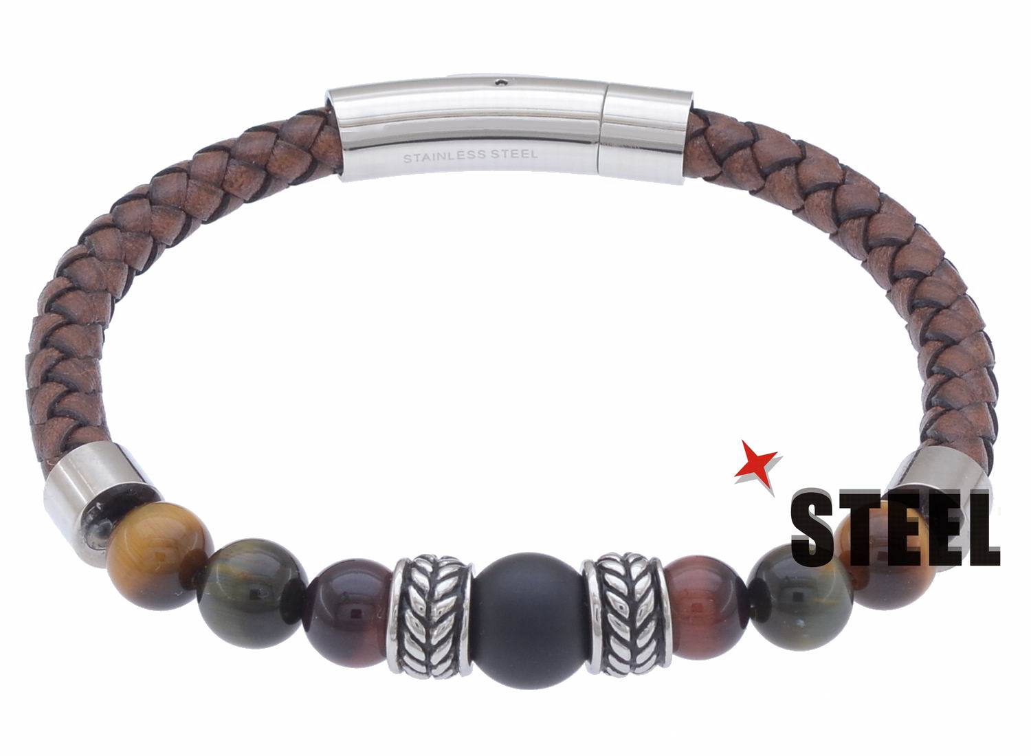 • 316 Stainless Steel Bracelet with high-quality Genuine Leather & multiple Tiger Eye stones