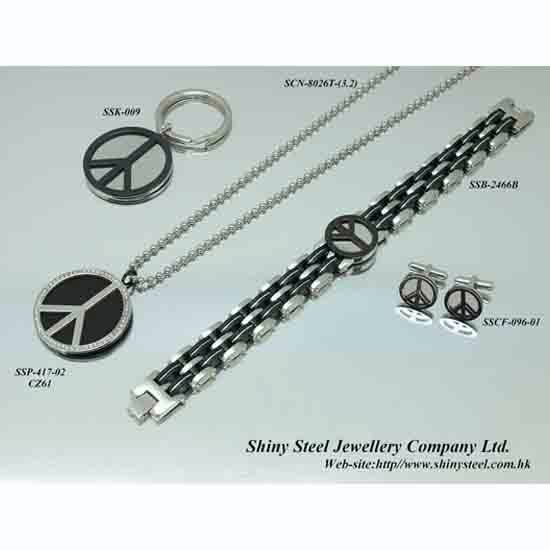 The jewelry set includes a necklace, a bracelet, a keychain and a pair of earrings. Each item is decorated with a peace sign highlighted by IP black plating and CZ stones, showcasing a touch of unique glamor. This jewelry set makes a great item to dress up your everyday ensemble.