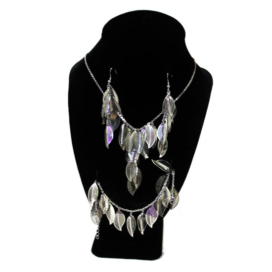 This stainless steel jewelry set includes a bracelet, earrings and a necklace. The items are crafted with leaf-shaped charms for style. This set is perfect for creating a unique, elegant and consistent look.