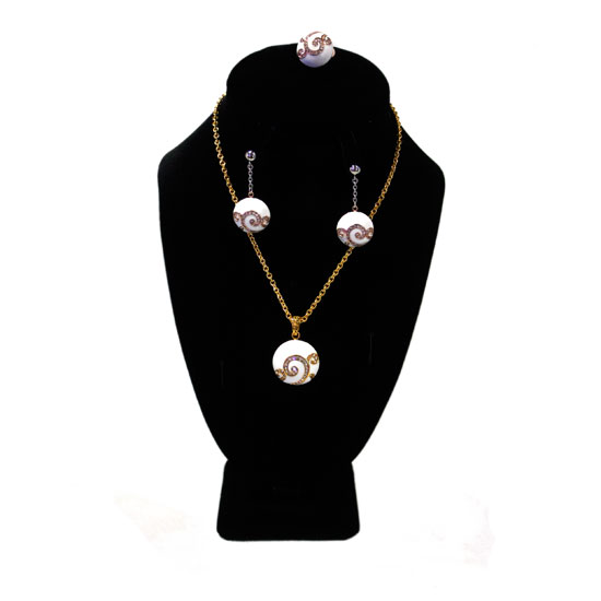 This stainless steel jewelry set includes a necklace, earrings and a finger ring. The items are crafted with round white embellishments made of resin. They are also accented with glossy swirly rhinestones.