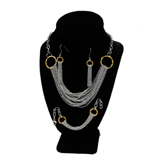 The jewelry set includes a necklace, a bracelet and a pair of earrings. The items are constructed of shiny stainless steel. Their big hoops are plated with brilliant gold for luxuriousness.
