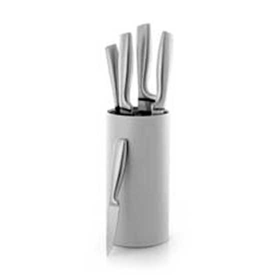 These kitchen knives are made of stainless steel for long lasting performance. The heavy-duty knives are placed in a cylindrical knife block for easy storage. These practical knives add a contemporary touch to your kitchen instantly.