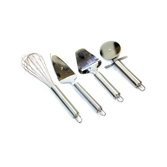 These kitchen utensils are made of stainless steel for durability. Each piece features a high-gloss finish for easy cleaning. These items are essential for any kitchen.