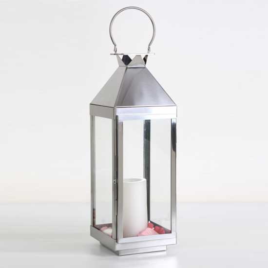 This attractive rectangular lantern is constructed from stainless steel and tempered glass for extra robustness. The four-side glass design allows you to have a good view of the candle inside. This distinctive lantern makes a great decoration to your home.