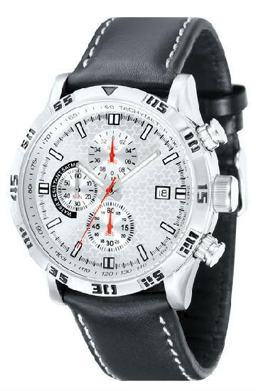 This fashionable watch features a sporty design with black genuine leather strap. The case is finely made of stainless steel and the black genuine leather strap is secured with an adjustable buckle clasp. The silver circular dial is decorated with bar-shaped hour index markers with three sub dials sitting at twelve, six and nine o’ clock position, and is completed with a date display window at three o’ clock position. Made from high quality materials, this watch is powered by chronograph movement with an easy-to-read bezel engraved with numbers in five-minute increments. This wristwatch surely is an essential item to keep in your wardrobe.