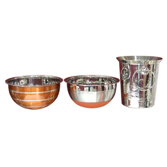 As shown are two stainless steel mixing bowls and one stainless steel ice bucket. They feature silicone bases and are lacquered. The mixing bowls are ideal utensils for making cakes, cookies, salad, etc. The ice bucket can accommodate a few bottles or cans of drinks to keep them cool for a significant period of time.