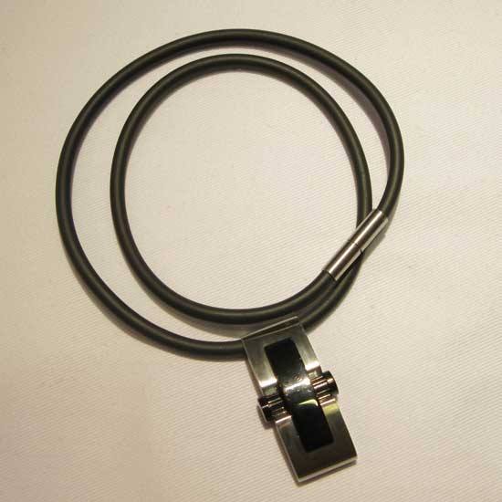 This fabulous necklace comes with a rectangular stainless steel pendant that appears like a jewelry clasp. This impressive necklace goes with a band in black. The stylish design appeals to Gothic-style lovers.