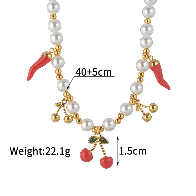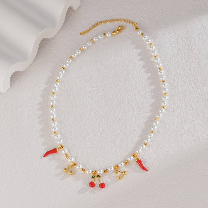Stainless Steel Pearl Necklace with Cherry and Chilly