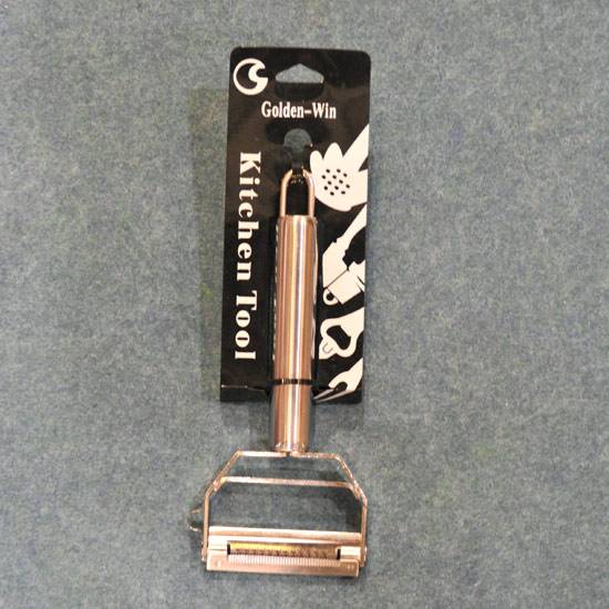 Metal blade attached to a stainless steel handle that is used for peeling certain vegetables, frequently potatoes, and fruits such as apples, pears, et cetera.