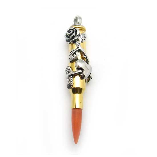Displayed is a stainless steel pendant featuring a long bullet shape. The silver-tone rose with a heart adds a passionate touch to the pendant for an unmatched style. Impress the people around you with this distinguishing pendant.
